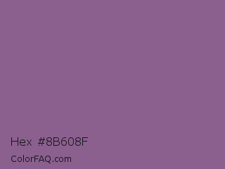 Hex #8b608f Color is a normal magenta color and the nearest color is French Lilac #86608e. Hex code #8b608f and RGB value is rgb(139,96,143). In RGB color space, this color is composed of 55% red, 38% green, 56% blue, In CMYK color space, this color is composed of 3% cyan, 33% magenta, 0% yellow , 44% black , In HSL color space, this color has a hue angle of 295° , 20% saturation and 47% lightness.