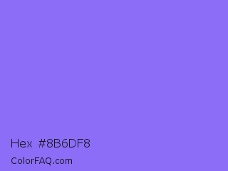 Hex #8b6df8 Color is a light indigo color and the nearest color is Medium Slate Blue #7b68ee. Hex code #8b6df8 and RGB value is rgb(139,109,248). In RGB color space, this color is composed of 55% red, 43% green, 97% blue, In CMYK color space, this color is composed of 44% cyan, 56% magenta, 0% yellow , 3% black , In HSL color space, this color has a hue angle of 253° , 91% saturation and 70% lightness.