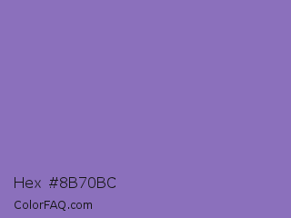 Hex #8b70bc Color is a normal violet color and the nearest color is Middle Blue Purple #8b72be. Hex code #8b70bc and RGB value is rgb(139,112,188). In RGB color space, this color is composed of 55% red, 44% green, 74% blue, In CMYK color space, this color is composed of 26% cyan, 40% magenta, 0% yellow , 26% black , In HSL color space, this color has a hue angle of 261° , 36% saturation and 59% lightness.