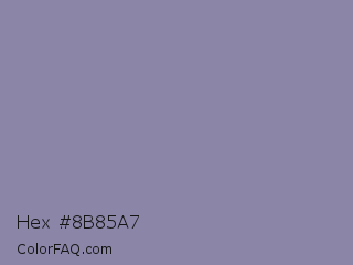 Hex #8b85a7 Color is a normal indigo color and the nearest color is Manatee Crayola #8d90a1. Hex code #8b85a7 and RGB value is rgb(139,133,167). In RGB color space, this color is composed of 55% red, 52% green, 65% blue, In CMYK color space, this color is composed of 17% cyan, 20% magenta, 0% yellow , 35% black , In HSL color space, this color has a hue angle of 251° , 16% saturation and 59% lightness.