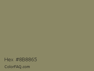 Hex #8b8865 Color is a normal yellow color and the nearest color is Avocado Pulp #888d65. Hex code #8b8865 and RGB value is rgb(139,136,101). In RGB color space, this color is composed of 55% red, 53% green, 40% blue, In CMYK color space, this color is composed of 0% cyan, 2% magenta, 27% yellow , 45% black , In HSL color space, this color has a hue angle of 55° , 16% saturation and 47% lightness.