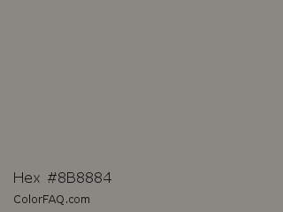 Hex #8b8884 Color is a normal orange color and the nearest color is Natural Gray #8b8680. Hex code #8b8884 and RGB value is rgb(139,136,132). In RGB color space, this color is composed of 55% red, 53% green, 52% blue, In CMYK color space, this color is composed of 0% cyan, 2% magenta, 5% yellow , 45% black , In HSL color space, this color has a hue angle of 34° , 3% saturation and 53% lightness.