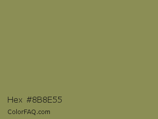 Hex #8b8e55 Color is a normal yellow color and the nearest color is Moss Green #8a9a5b. Hex code #8b8e55 and RGB value is rgb(139,142,85). In RGB color space, this color is composed of 55% red, 56% green, 33% blue, In CMYK color space, this color is composed of 2% cyan, 0% magenta, 40% yellow , 44% black , In HSL color space, this color has a hue angle of 63° , 25% saturation and 45% lightness.