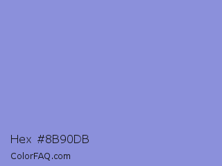 Hex #8b90db Color is a light blue color and the nearest color is Chetwode Blue #8581d9. Hex code #8b90db and RGB value is rgb(139,144,219). In RGB color space, this color is composed of 55% red, 56% green, 86% blue, In CMYK color space, this color is composed of 37% cyan, 34% magenta, 0% yellow , 14% black , In HSL color space, this color has a hue angle of 236° , 53% saturation and 70% lightness.