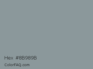 Hex #8b989b Color is a normal cyan color and the nearest color is Regent Gray #86949f. Hex code #8b989b and RGB value is rgb(139,152,155). In RGB color space, this color is composed of 55% red, 60% green, 61% blue, In CMYK color space, this color is composed of 10% cyan, 2% magenta, 0% yellow , 39% black , In HSL color space, this color has a hue angle of 191° , 7% saturation and 58% lightness.