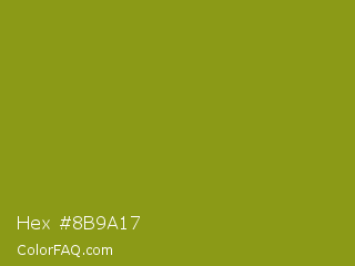 Hex #8b9a17 Color is a normal yellow color and the nearest color is Trendy Green #7c881a. Hex code #8b9a17 and RGB value is rgb(139,154,23). In RGB color space, this color is composed of 55% red, 60% green, 9% blue, In CMYK color space, this color is composed of 10% cyan, 0% magenta, 85% yellow , 40% black , In HSL color space, this color has a hue angle of 67° , 74% saturation and 35% lightness.