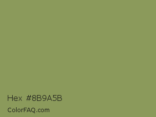 Hex #8b9a5b Color is a normal lime color and the nearest color is Moss Green #8a9a5b. Hex code #8b9a5b and RGB value is rgb(139,154,91). In RGB color space, this color is composed of 55% red, 60% green, 36% blue, In CMYK color space, this color is composed of 10% cyan, 0% magenta, 41% yellow , 40% black , In HSL color space, this color has a hue angle of 74° , 26% saturation and 48% lightness.
