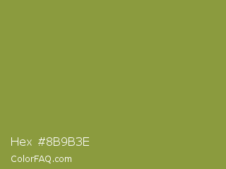 Hex #8b9b3e Color is a normal yellow color and the nearest color is Sycamore #908d39. Hex code #8b9b3e and RGB value is rgb(139,155,62). In RGB color space, this color is composed of 55% red, 61% green, 24% blue, In CMYK color space, this color is composed of 10% cyan, 0% magenta, 60% yellow , 39% black , In HSL color space, this color has a hue angle of 70° , 43% saturation and 43% lightness.