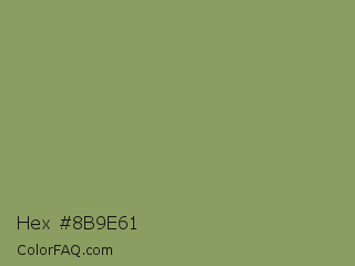 Hex #8b9e61 Color is a normal lime color and the nearest color is Moss Green #8a9a5b. Hex code #8b9e61 and RGB value is rgb(139,158,97). In RGB color space, this color is composed of 55% red, 62% green, 38% blue, In CMYK color space, this color is composed of 12% cyan, 0% magenta, 39% yellow , 38% black , In HSL color space, this color has a hue angle of 79° , 24% saturation and 50% lightness.