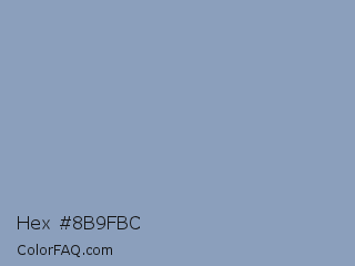 Hex #8b9fbc Color is a light blue color and the nearest color is Pewter Blue #8ba8b7. Hex code #8b9fbc and RGB value is rgb(139,159,188). In RGB color space, this color is composed of 55% red, 62% green, 74% blue, In CMYK color space, this color is composed of 26% cyan, 15% magenta, 0% yellow , 26% black , In HSL color space, this color has a hue angle of 216° , 27% saturation and 64% lightness.