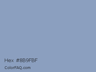 Hex #8b9fbf Color is a light blue color and the nearest color is Pewter Blue #8ba8b7. Hex code #8b9fbf and RGB value is rgb(139,159,191). In RGB color space, this color is composed of 55% red, 62% green, 75% blue, In CMYK color space, this color is composed of 27% cyan, 17% magenta, 0% yellow , 25% black , In HSL color space, this color has a hue angle of 217° , 29% saturation and 65% lightness.