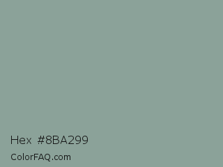 Hex #8ba299 Color is a normal green color and the nearest color is Morning Blue #8da399. Hex code #8ba299 and RGB value is rgb(139,162,153). In RGB color space, this color is composed of 55% red, 64% green, 60% blue, In CMYK color space, this color is composed of 14% cyan, 0% magenta, 6% yellow , 36% black , In HSL color space, this color has a hue angle of 157° , 11% saturation and 59% lightness.