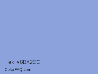 Hex #8ba2dc Color is a light blue color and the nearest color is Light Cobalt Blue #88ace0. Hex code #8ba2dc and RGB value is rgb(139,162,220). In RGB color space, this color is composed of 55% red, 64% green, 86% blue, In CMYK color space, this color is composed of 37% cyan, 26% magenta, 0% yellow , 14% black , In HSL color space, this color has a hue angle of 223° , 54% saturation and 70% lightness.