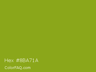 Hex #8ba71a Color is a normal lime color and the nearest color is Citron #9fa91f. Hex code #8ba71a and RGB value is rgb(139,167,26). In RGB color space, this color is composed of 55% red, 65% green, 10% blue, In CMYK color space, this color is composed of 17% cyan, 0% magenta, 84% yellow , 35% black , In HSL color space, this color has a hue angle of 72° , 73% saturation and 38% lightness.