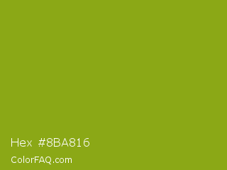 Hex #8ba816 Color is a normal lime color and the nearest color is Citron #9fa91f. Hex code #8ba816 and RGB value is rgb(139,168,22). In RGB color space, this color is composed of 55% red, 66% green, 9% blue, In CMYK color space, this color is composed of 17% cyan, 0% magenta, 87% yellow , 34% black , In HSL color space, this color has a hue angle of 72° , 77% saturation and 37% lightness.