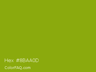 Hex #8baa0d Color is a normal lime color and the nearest color is Apple Green #8db600. Hex code #8baa0d and RGB value is rgb(139,170,13). In RGB color space, this color is composed of 55% red, 67% green, 5% blue, In CMYK color space, this color is composed of 18% cyan, 0% magenta, 92% yellow , 33% black , In HSL color space, this color has a hue angle of 72° , 86% saturation and 36% lightness.