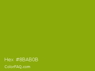 Hex #8bab0b Color is a normal lime color and the nearest color is Apple Green #8db600. Hex code #8bab0b and RGB value is rgb(139,171,11). In RGB color space, this color is composed of 55% red, 67% green, 4% blue, In CMYK color space, this color is composed of 19% cyan, 0% magenta, 94% yellow , 33% black , In HSL color space, this color has a hue angle of 72° , 88% saturation and 36% lightness.