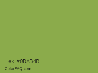 Hex #8bab4b Color is a normal green color and the nearest color is Sushi #87ab39. Hex code #8bab4b and RGB value is rgb(139,171,75). In RGB color space, this color is composed of 55% red, 67% green, 29% blue, In CMYK color space, this color is composed of 19% cyan, 0% magenta, 56% yellow , 33% black , In HSL color space, this color has a hue angle of 80° , 39% saturation and 48% lightness.