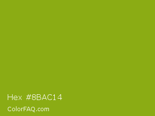 Hex #8bac14 Color is a normal lime color and the nearest color is Apple Green #8db600. Hex code #8bac14 and RGB value is rgb(139,172,20). In RGB color space, this color is composed of 55% red, 67% green, 8% blue, In CMYK color space, this color is composed of 19% cyan, 0% magenta, 88% yellow , 33% black , In HSL color space, this color has a hue angle of 73° , 79% saturation and 38% lightness.