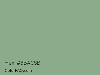 Hex #8bac8b Color is a light green color and the nearest color is Envy #8ba690. Hex code #8bac8b and RGB value is rgb(139,172,139). In RGB color space, this color is composed of 55% red, 67% green, 55% blue, In CMYK color space, this color is composed of 19% cyan, 0% magenta, 19% yellow , 33% black , In HSL color space, this color has a hue angle of 120° , 17% saturation and 61% lightness.