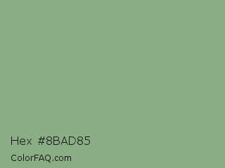Hex #8bad85 Color is a normal green color and the nearest color is Envy #8ba690. Hex code #8bad85 and RGB value is rgb(139,173,133). In RGB color space, this color is composed of 55% red, 68% green, 52% blue, In CMYK color space, this color is composed of 20% cyan, 0% magenta, 23% yellow , 32% black , In HSL color space, this color has a hue angle of 111° , 20% saturation and 60% lightness.