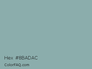 Hex #8badac Color is a light cyan color and the nearest color is Cascade #8ba9a5. Hex code #8badac and RGB value is rgb(139,173,172). In RGB color space, this color is composed of 55% red, 68% green, 67% blue, In CMYK color space, this color is composed of 20% cyan, 0% magenta, 1% yellow , 32% black , In HSL color space, this color has a hue angle of 178° , 17% saturation and 61% lightness.