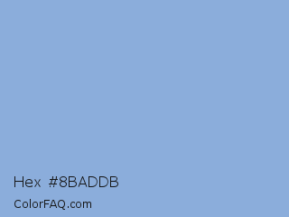 Hex #8baddb Color is a light blue color and the nearest color is Light Cobalt Blue #88ace0. Hex code #8baddb and RGB value is rgb(139,173,219). In RGB color space, this color is composed of 55% red, 68% green, 86% blue, In CMYK color space, this color is composed of 37% cyan, 21% magenta, 0% yellow , 14% black , In HSL color space, this color has a hue angle of 215° , 53% saturation and 70% lightness.