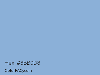 Hex #8bb0d8 Color is a light blue color and the nearest color is Light Cobalt Blue #88ace0. Hex code #8bb0d8 and RGB value is rgb(139,176,216). In RGB color space, this color is composed of 55% red, 69% green, 85% blue, In CMYK color space, this color is composed of 36% cyan, 19% magenta, 0% yellow , 15% black , In HSL color space, this color has a hue angle of 211° , 50% saturation and 70% lightness.