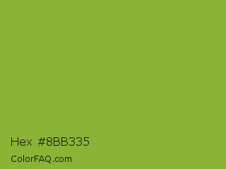Hex #8bb335 Color is a normal lime color and the nearest color is Sushi #87ab39. Hex code #8bb335 and RGB value is rgb(139,179,53). In RGB color space, this color is composed of 55% red, 70% green, 21% blue, In CMYK color space, this color is composed of 22% cyan, 0% magenta, 70% yellow , 30% black , In HSL color space, this color has a hue angle of 79° , 54% saturation and 45% lightness.