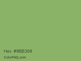 Hex #8bb368 Color is a normal green color and the nearest color is Dollar Bill #85bb65. Hex code #8bb368 and RGB value is rgb(139,179,104). In RGB color space, this color is composed of 55% red, 70% green, 41% blue, In CMYK color space, this color is composed of 22% cyan, 0% magenta, 42% yellow , 30% black , In HSL color space, this color has a hue angle of 92° , 33% saturation and 55% lightness.