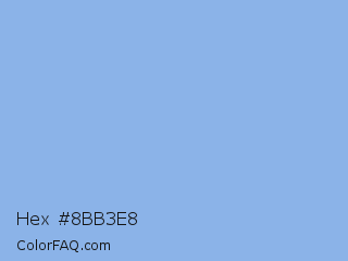 Hex #8bb3e8 Color is a light blue color and the nearest color is Jordy Blue #8ab9f1. Hex code #8bb3e8 and RGB value is rgb(139,179,232). In RGB color space, this color is composed of 55% red, 70% green, 91% blue, In CMYK color space, this color is composed of 40% cyan, 23% magenta, 0% yellow , 9% black , In HSL color space, this color has a hue angle of 214° , 67% saturation and 73% lightness.