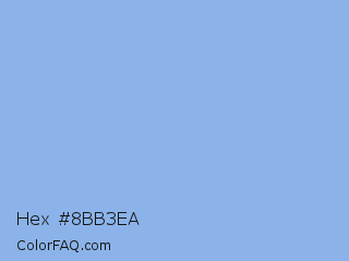 Hex #8bb3ea Color is a light blue color and the nearest color is Jordy Blue #8ab9f1. Hex code #8bb3ea and RGB value is rgb(139,179,234). In RGB color space, this color is composed of 55% red, 70% green, 92% blue, In CMYK color space, this color is composed of 41% cyan, 24% magenta, 0% yellow , 8% black , In HSL color space, this color has a hue angle of 215° , 69% saturation and 73% lightness.