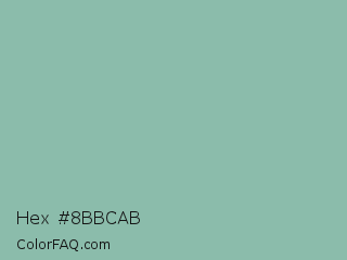 Hex #8bbcab Color is a light green color and the nearest color is Summer Green #96bbab. Hex code #8bbcab and RGB value is rgb(139,188,171). In RGB color space, this color is composed of 55% red, 74% green, 67% blue, In CMYK color space, this color is composed of 26% cyan, 0% magenta, 9% yellow , 26% black , In HSL color space, this color has a hue angle of 159° , 27% saturation and 64% lightness.