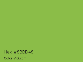 Hex #8bbd48 Color is a normal green color and the nearest color is Sushi #87ab39. Hex code #8bbd48 and RGB value is rgb(139,189,72). In RGB color space, this color is composed of 55% red, 74% green, 28% blue, In CMYK color space, this color is composed of 26% cyan, 0% magenta, 62% yellow , 26% black , In HSL color space, this color has a hue angle of 86° , 47% saturation and 51% lightness.