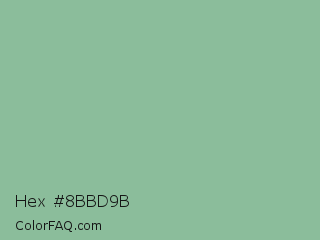 Hex #8bbd9b Color is a light green color and the nearest color is Dark Sea Green #8fbc8f. Hex code #8bbd9b and RGB value is rgb(139,189,155). In RGB color space, this color is composed of 55% red, 74% green, 61% blue, In CMYK color space, this color is composed of 26% cyan, 0% magenta, 18% yellow , 26% black , In HSL color space, this color has a hue angle of 139° , 27% saturation and 64% lightness.