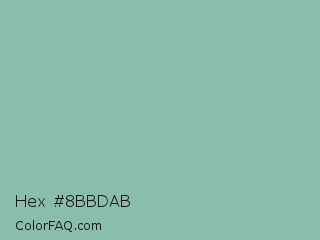 Hex #8bbdab Color is a light green color and the nearest color is Summer Green #96bbab. Hex code #8bbdab and RGB value is rgb(139,189,171). In RGB color space, this color is composed of 55% red, 74% green, 67% blue, In CMYK color space, this color is composed of 26% cyan, 0% magenta, 10% yellow , 26% black , In HSL color space, this color has a hue angle of 158° , 27% saturation and 64% lightness.