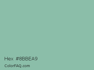 Hex #8bbea9 Color is a light green color and the nearest color is Summer Green #96bbab. Hex code #8bbea9 and RGB value is rgb(139,190,169). In RGB color space, this color is composed of 55% red, 75% green, 66% blue, In CMYK color space, this color is composed of 27% cyan, 0% magenta, 11% yellow , 25% black , In HSL color space, this color has a hue angle of 155° , 28% saturation and 65% lightness.