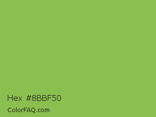 Hex #8bbf50 Color is a normal green color and the nearest color is Dollar Bill #85bb65. Hex code #8bbf50 and RGB value is rgb(139,191,80). In RGB color space, this color is composed of 55% red, 75% green, 31% blue, In CMYK color space, this color is composed of 27% cyan, 0% magenta, 58% yellow , 25% black , In HSL color space, this color has a hue angle of 88° , 46% saturation and 53% lightness.