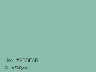 Hex #8bbfab Color is a light green color and the nearest color is Summer Green #96bbab. Hex code #8bbfab and RGB value is rgb(139,191,171). In RGB color space, this color is composed of 55% red, 75% green, 67% blue, In CMYK color space, this color is composed of 27% cyan, 0% magenta, 10% yellow , 25% black , In HSL color space, this color has a hue angle of 157° , 29% saturation and 65% lightness.