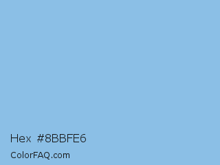 Hex #8bbfe6 Color is a light blue color and the nearest color is Jordy Blue #8ab9f1. Hex code #8bbfe6 and RGB value is rgb(139,191,230). In RGB color space, this color is composed of 55% red, 75% green, 90% blue, In CMYK color space, this color is composed of 40% cyan, 17% magenta, 0% yellow , 10% black , In HSL color space, this color has a hue angle of 206° , 65% saturation and 72% lightness.