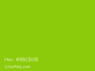 Hex #8bcb0b Color is a normal green color and the nearest color is Sheen Green #8fd400. Hex code #8bcb0b and RGB value is rgb(139,203,11). In RGB color space, this color is composed of 55% red, 80% green, 4% blue, In CMYK color space, this color is composed of 32% cyan, 0% magenta, 95% yellow , 20% black , In HSL color space, this color has a hue angle of 80° , 90% saturation and 42% lightness.