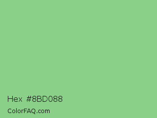 Hex #8bd088 Color is a light green color and the nearest color is De York #7ac488. Hex code #8bd088 and RGB value is rgb(139,208,136). In RGB color space, this color is composed of 55% red, 82% green, 53% blue, In CMYK color space, this color is composed of 33% cyan, 0% magenta, 35% yellow , 18% black , In HSL color space, this color has a hue angle of 118° , 43% saturation and 67% lightness.