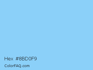 Hex #8bd0f9 Color is a light blue color and the nearest color is Light Sky Blue #87cefa. Hex code #8bd0f9 and RGB value is rgb(139,208,249). In RGB color space, this color is composed of 55% red, 82% green, 98% blue, In CMYK color space, this color is composed of 44% cyan, 16% magenta, 0% yellow , 2% black , In HSL color space, this color has a hue angle of 202° , 90% saturation and 76% lightness.