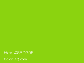 Hex #8bd30f Color is a normal green color and the nearest color is Sheen Green #8fd400. Hex code #8bd30f and RGB value is rgb(139,211,15). In RGB color space, this color is composed of 55% red, 83% green, 6% blue, In CMYK color space, this color is composed of 34% cyan, 0% magenta, 93% yellow , 17% black , In HSL color space, this color has a hue angle of 82° , 87% saturation and 44% lightness.