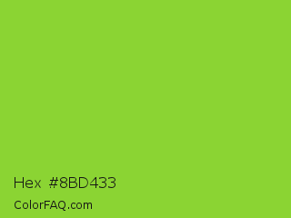 Hex #8bd433 Color is a normal green color and the nearest color is Atlantis #97cd2d. Hex code #8bd433 and RGB value is rgb(139,212,51). In RGB color space, this color is composed of 55% red, 83% green, 20% blue, In CMYK color space, this color is composed of 34% cyan, 0% magenta, 76% yellow , 17% black , In HSL color space, this color has a hue angle of 87° , 65% saturation and 52% lightness.