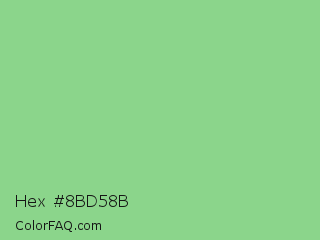 Hex #8bd58b Color is a light green color and the nearest color is Feijoa #9fdd8c. Hex code #8bd58b and RGB value is rgb(139,213,139). In RGB color space, this color is composed of 55% red, 84% green, 55% blue, In CMYK color space, this color is composed of 35% cyan, 0% magenta, 35% yellow , 16% black , In HSL color space, this color has a hue angle of 120° , 47% saturation and 69% lightness.