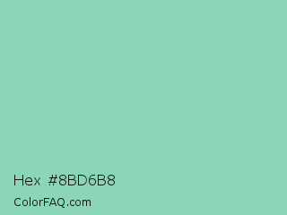 Hex #8bd6b8 Color is a light green color and the nearest color is Vista Blue #8fd6b4. Hex code #8bd6b8 and RGB value is rgb(139,214,184). In RGB color space, this color is composed of 55% red, 84% green, 72% blue, In CMYK color space, this color is composed of 35% cyan, 0% magenta, 14% yellow , 16% black , In HSL color space, this color has a hue angle of 156° , 48% saturation and 69% lightness.