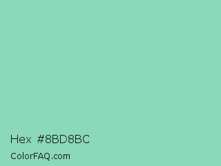 Hex #8bd8bc Color is a light green color and the nearest color is Pearl Aqua #88d8c0. Hex code #8bd8bc and RGB value is rgb(139,216,188). In RGB color space, this color is composed of 55% red, 85% green, 74% blue, In CMYK color space, this color is composed of 36% cyan, 0% magenta, 13% yellow , 15% black , In HSL color space, this color has a hue angle of 158° , 50% saturation and 70% lightness.