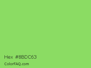Hex #8bdc63 Color is a light green color and the nearest color is Pastel Green #77dd77. Hex code #8bdc63 and RGB value is rgb(139,220,99). In RGB color space, this color is composed of 55% red, 86% green, 39% blue, In CMYK color space, this color is composed of 37% cyan, 0% magenta, 55% yellow , 14% black , In HSL color space, this color has a hue angle of 100° , 63% saturation and 63% lightness.