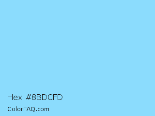 Hex #8bdcfd Color is a light blue color and the nearest color is Pale Cyan #87d3f8. Hex code #8bdcfd and RGB value is rgb(139,220,253). In RGB color space, this color is composed of 55% red, 86% green, 99% blue, In CMYK color space, this color is composed of 45% cyan, 13% magenta, 0% yellow , 1% black , In HSL color space, this color has a hue angle of 197° , 97% saturation and 77% lightness.